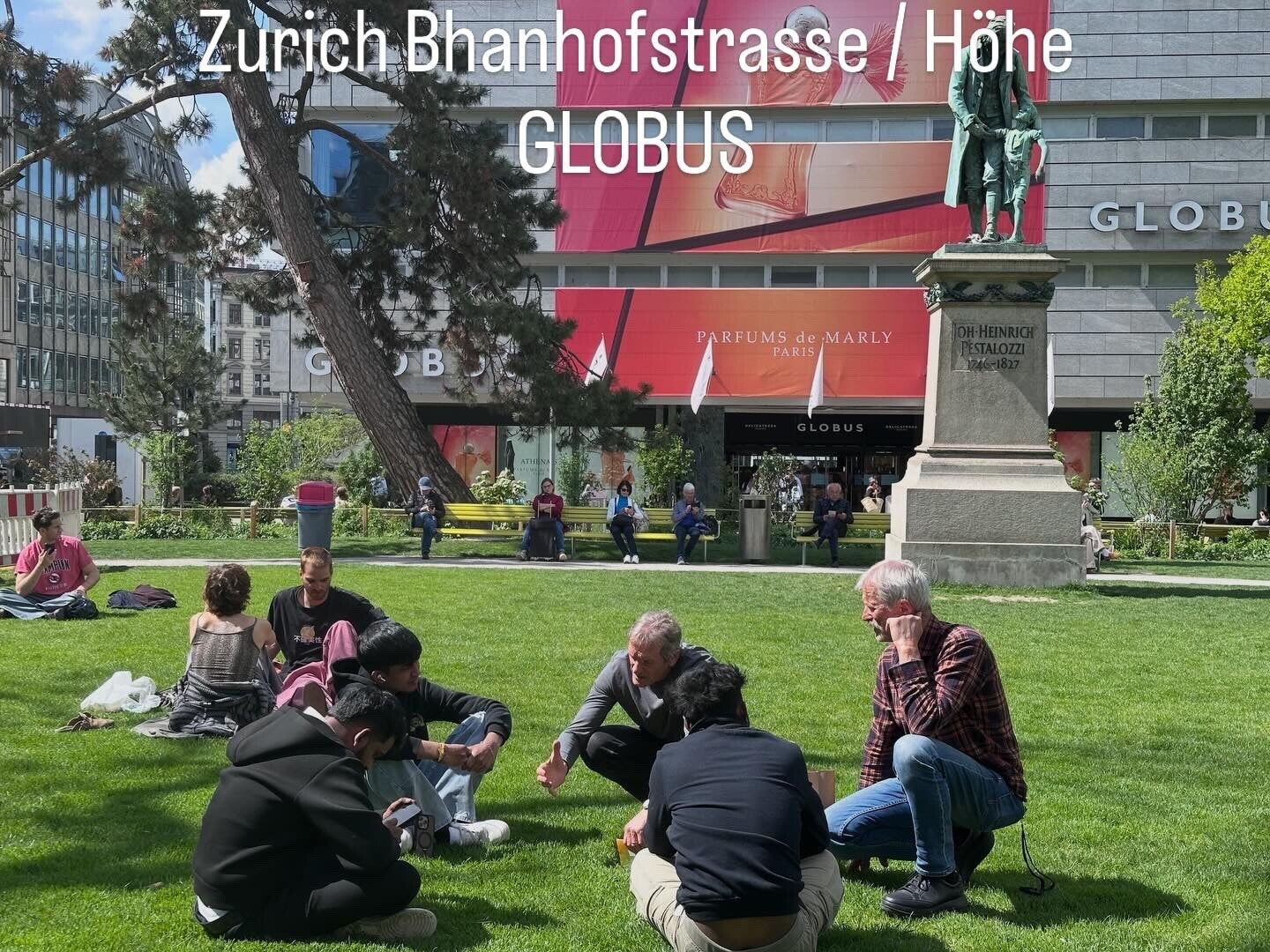 Ein Treffpunkt im Freien mit einem Pavillon, in Zūrich zentrum, damit Passanten sofort erkennen, dass sie hier innehalten und ungezwungen reden können und ohne Druck willkommen sind.